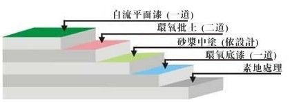 ⑥自流平面漆:用自流平型環(huán)氧面漆均勻鏝涂一道,完工后達(dá)到光亮潔凈,顏色均一,無空鼓;